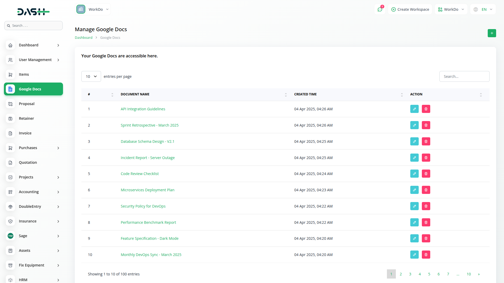 After authorization, a dedicated Google Docs section appears in the sidebar for easy navigation. You can create new documents instantly using the Create button. The interface lists all your Google Docs—both those you we created and documents shared with you—for seamless access. Everything is displayed in a clean, user-friendly layout.