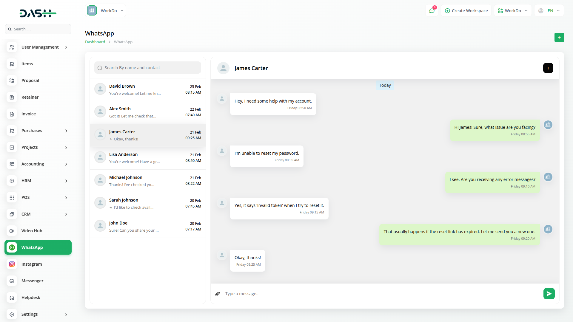 The WhatsApp Chat module on Dash SaaS helps businesses communicate with customers easily and efficiently. Instead of switching between multiple apps, you can handle all your WhatsApp conversations directly from the Dash portal. Whether it`s answering customer queries, resolving issues, or sharing important updates, this integration allows you to manage everything from one place. With a structured approach to messaging, you can stay organized, reduce response time, and ensure that no customer message goes unanswered. This makes it easier to provide excellent customer service while keeping all conversations in a single, convenient platform.