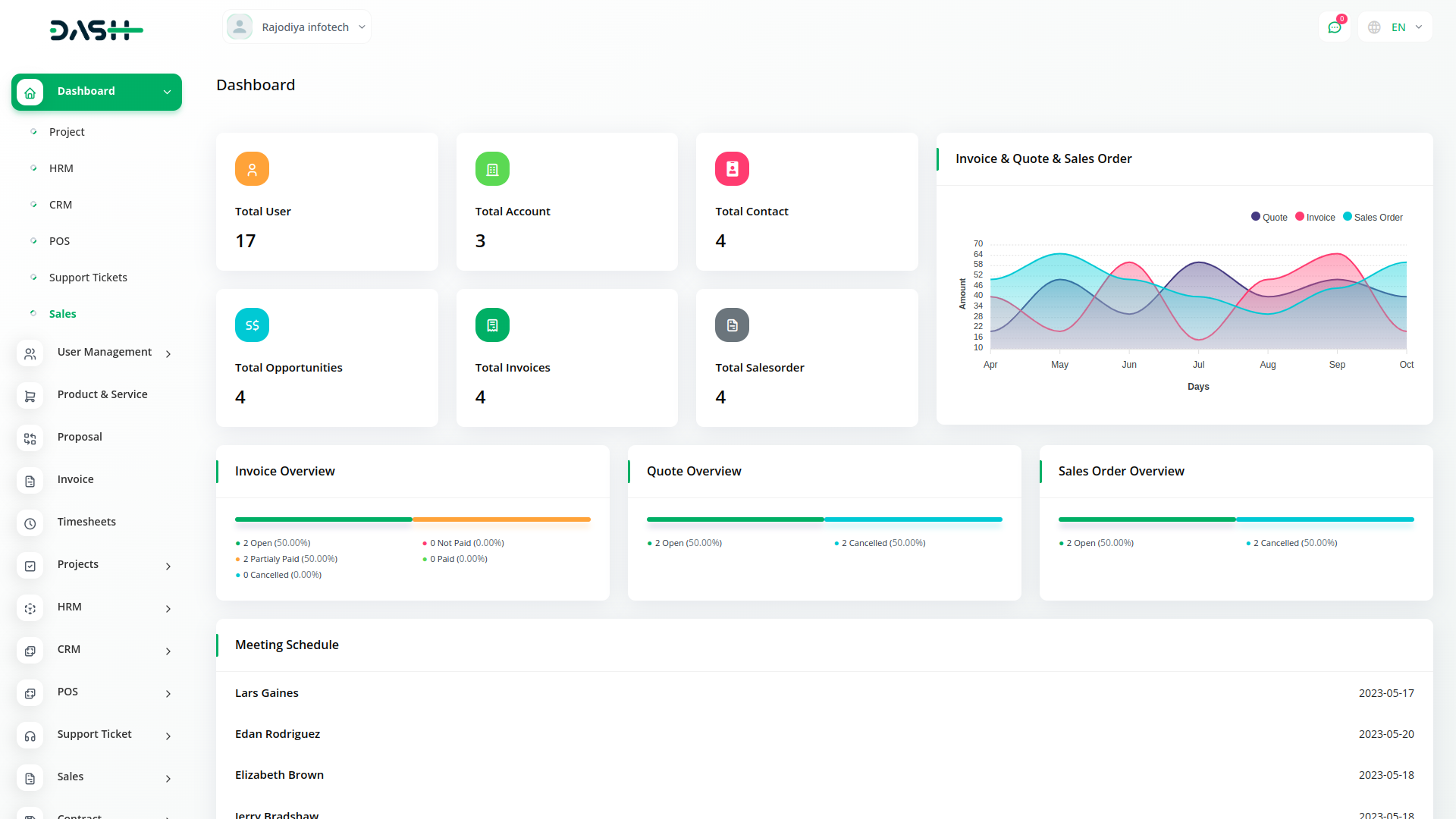 You can also find the individual overview of each of these elements broken down in percentages with their respective status. Additionally, know the top due tasks, meeting schedule, and monthly calls on this dashboard.