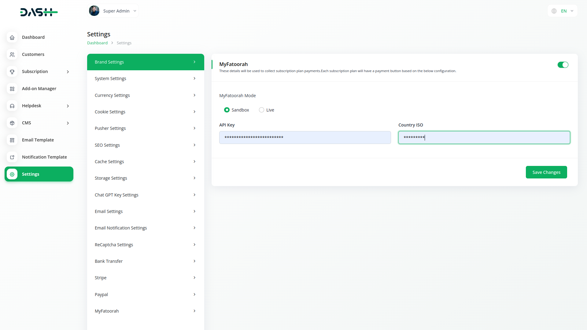 MyFatoorah acts as a powerful bridge between your Dash SaaS platform and a diverse network of payment options. This integration simplifies your payment processing by allowing you to accept a wide range of options preferred by your global customers. By leveraging MyFatoorah, you can eliminate the need to manage multiple payment processors and ensure a smooth checkout experience for al.